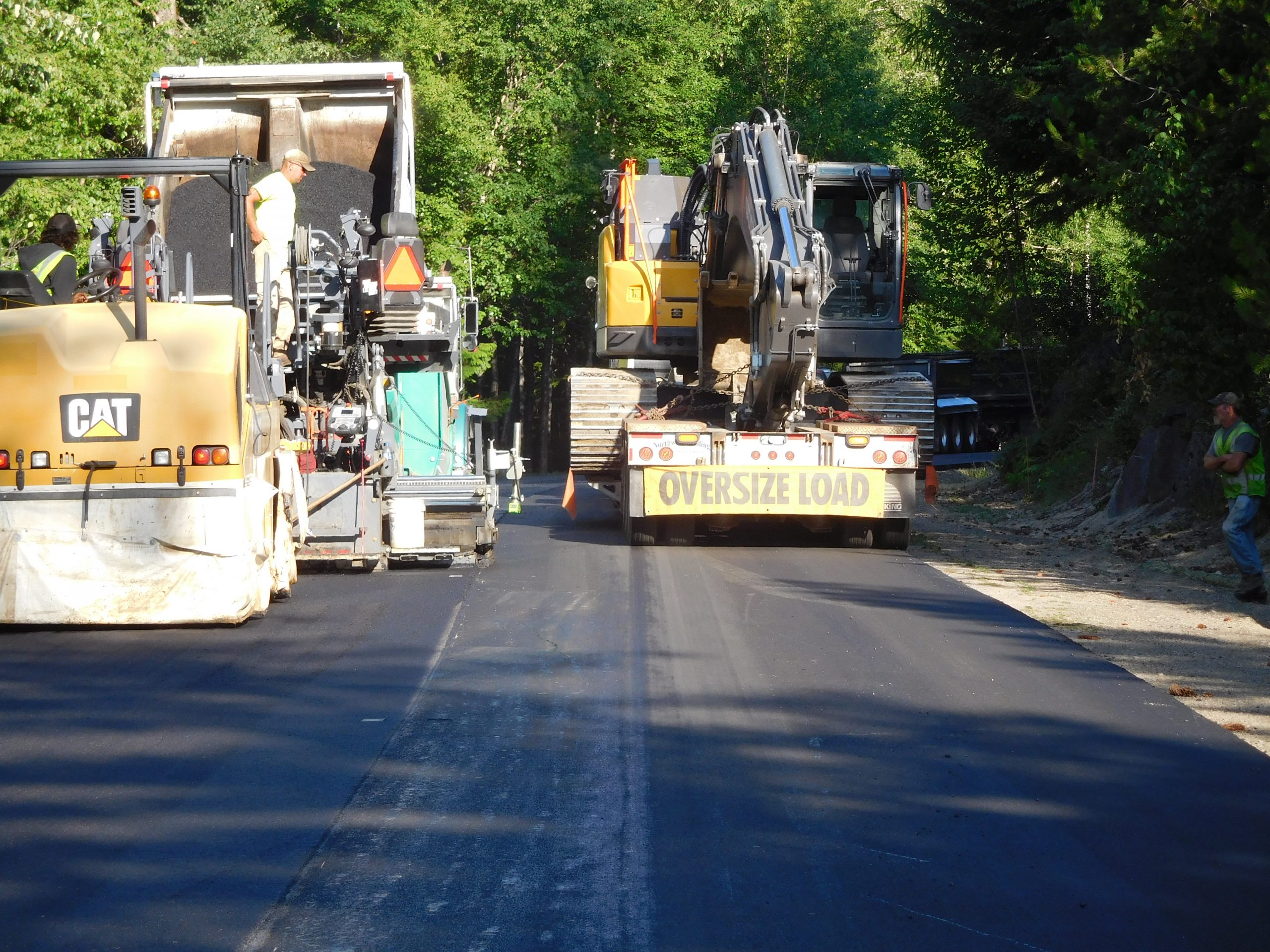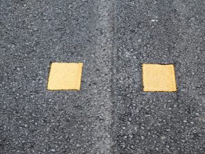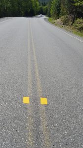 After the paving is completed, the IHD crew installs custom cut 4” x 4” pieces of reflective yellow preformed thermoplastic marking material in the divots along the roadway. The thermoplastic markers sit below the road surface, so when the road is plowed, they do not get scraped off.