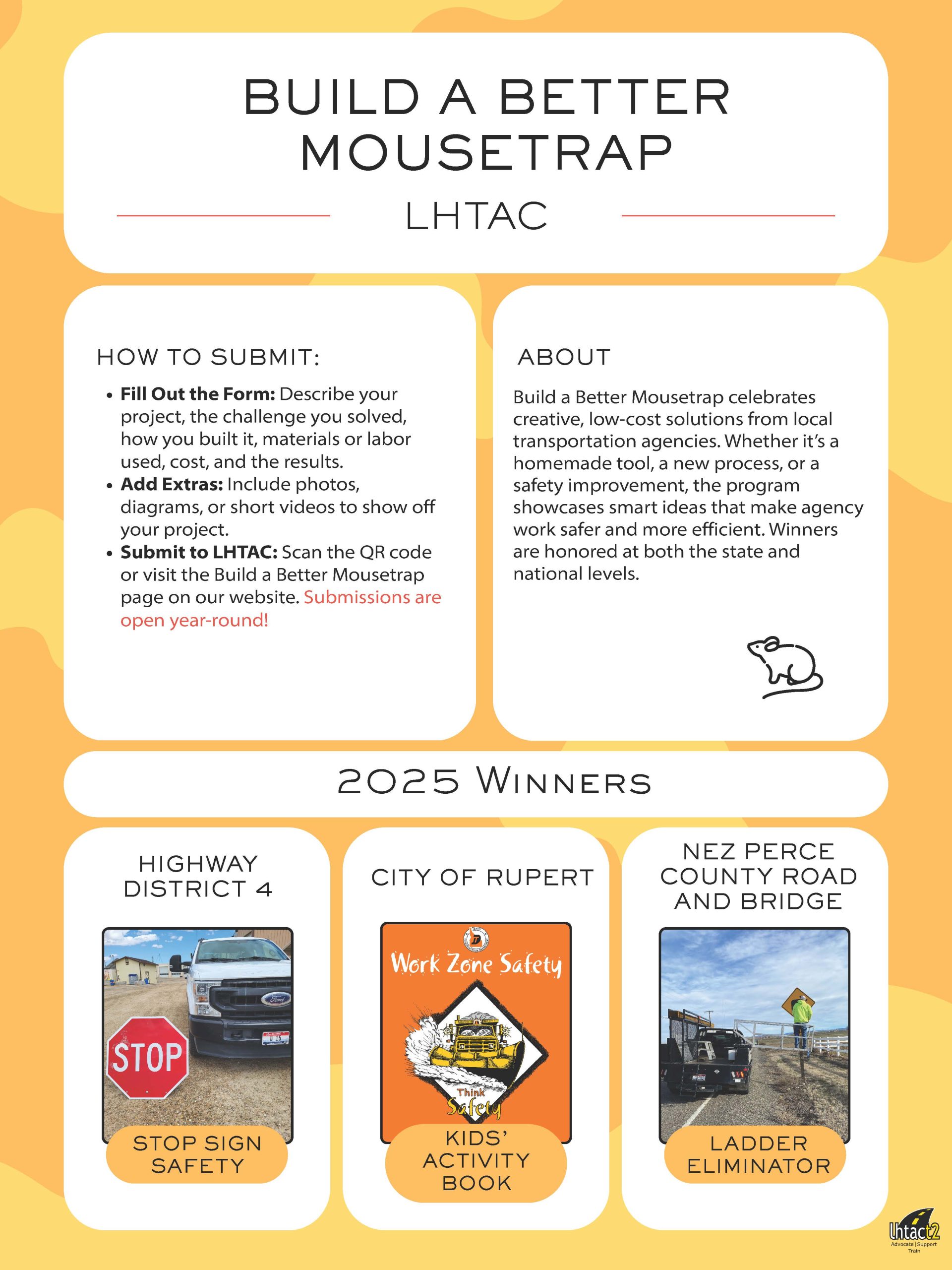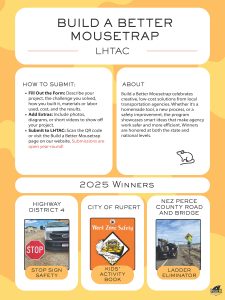 The National Build a Better Mousetrap Competition allows Local Highway Jurisdictions to share creative ideas! LHTAC has updated the submissions to be open all year. Share today!